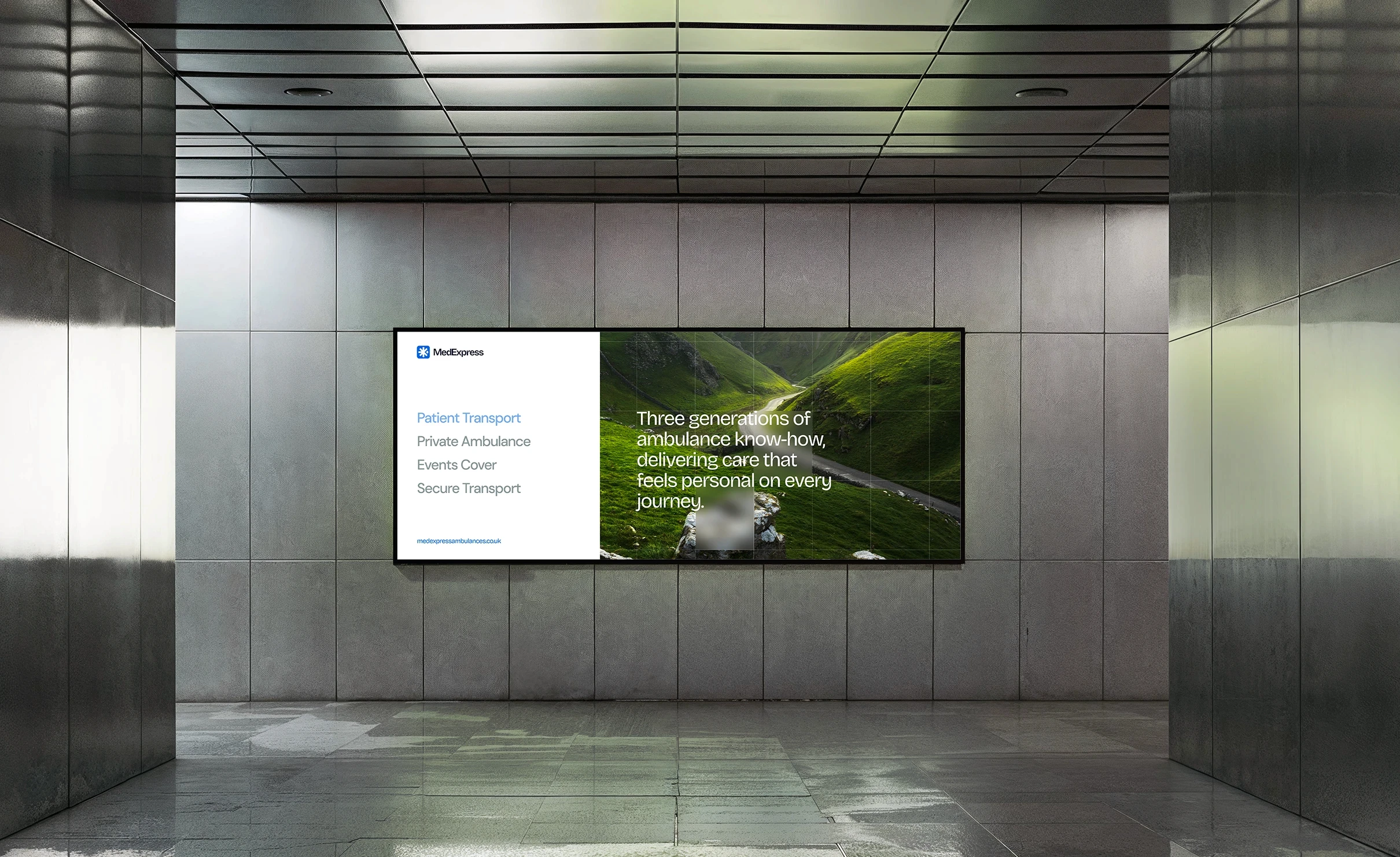 MedExpress move people when it matters most, and the brand needed to reflect that quiet sense of trust. I led the identity work end to end, shaping a logotype, signage, uniform marks, website, and guidelines that feel human, dependable, and unmistakably clinical in the best sense of the word. The result is a brand that travels well, on a uniform badge, a waiting room sign, a booking screen, or the website itself, and meets every patient with the same reassurance.